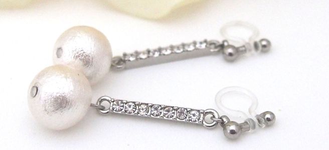 Today, I would like to introduce the ideal autumn and winter jewelries. They are Swarovski crystal and rich gray cotton pearl invisible clip on earrings. I released several cotton pearl earrings but not so many about gray and black pearl ones. Please take a look at these lustrous pearls. They change the color from different angles: they are not simple gray, they have purplish shine on their surface. They seem rich south sea pearls. The combination of sparkly crystal and rich taste of pearls are gorgeous. They make you shine even in winter gloomy weather!
